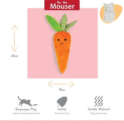 De Happy Pet Tabby Patch Wortel Kicker is een vrolijk kattenspeeltje in de vorm van een wortel, ontworpen om het natuurlijke speel- en jachtgedrag van katten te prikkelen. Door het langwerpige formaat is deze kicker ideaal om tegenaan te trappen en vast te houden met de voorpoten, terwijl het zachte pluche uitnodigt tot knuffelen en spelen. De speelse uitstraling maakt dit speeltje aantrekkelijk voor dagelijks vermaak en afwisseling in het speelgoedaanbod van je kat.